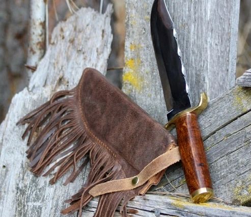 The sheath is set up to be carried behind the back. O1 steel with Iron wood handle and brass guard and cap.